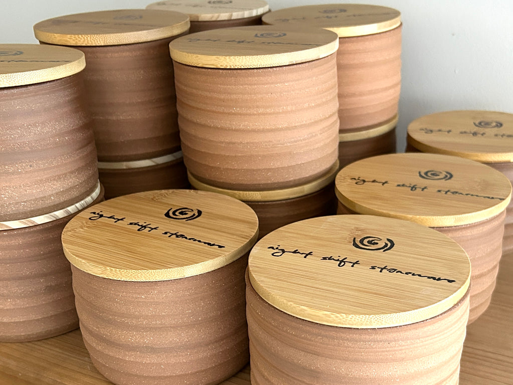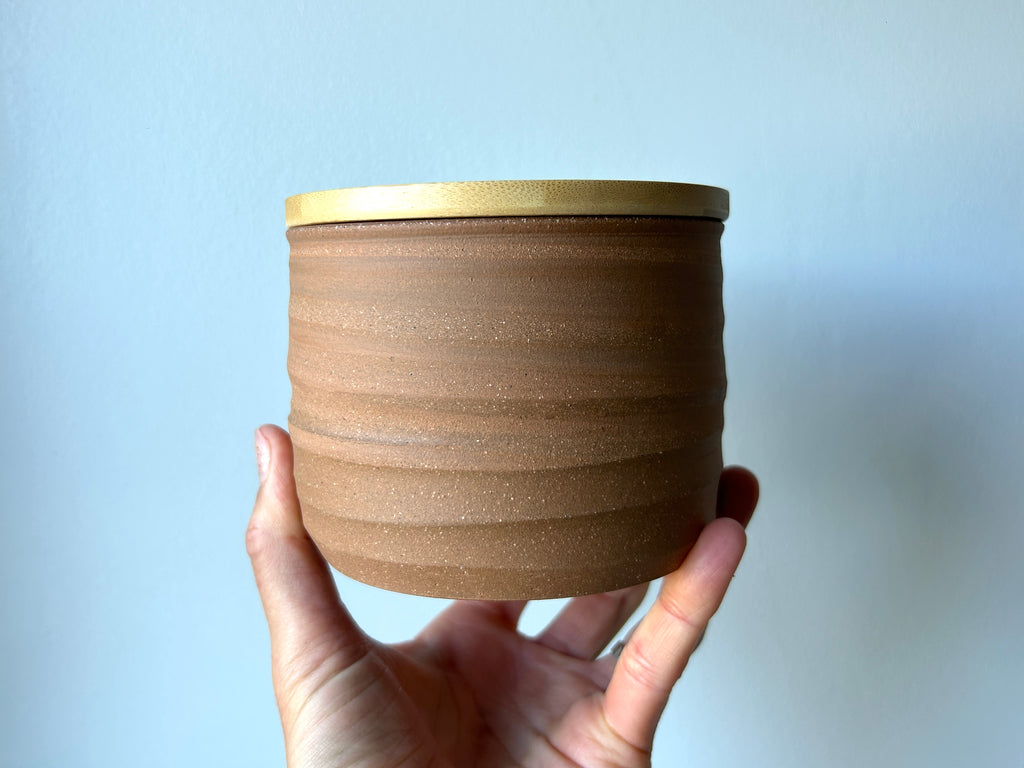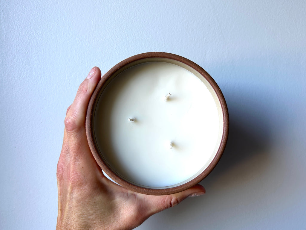 Hand-poured with an organic soy wax. Interior container glaze varies and exterior left unglazed. Choose from cardamom and cream, or sweet vanilla. (Looking ahead: Douglas fir coming in end of November; pink grapefruit and garden mint coming next spring)