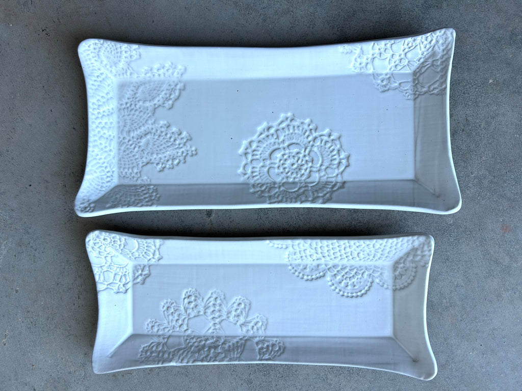 set of 2 nesting handbuilt slab trays with doily impressions in matte white, underside is unglazed, approximately 14” x 6.5” and 12” x 5”