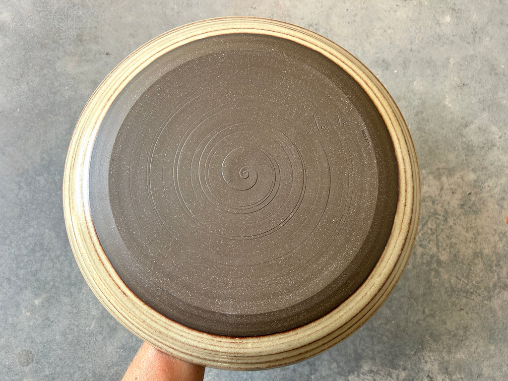 This is only the second heirloom bowl I’ve made in this darker clay. Glazed with ‘chai’ glaze, it measures 15.5” in diameter and only 2.25” in height (very shallow!)