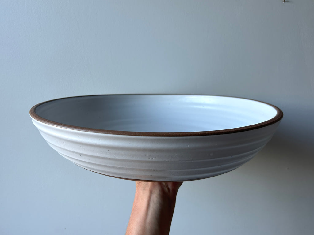 Matte white, raw rim, measures 16” diameter x 3.5” in height