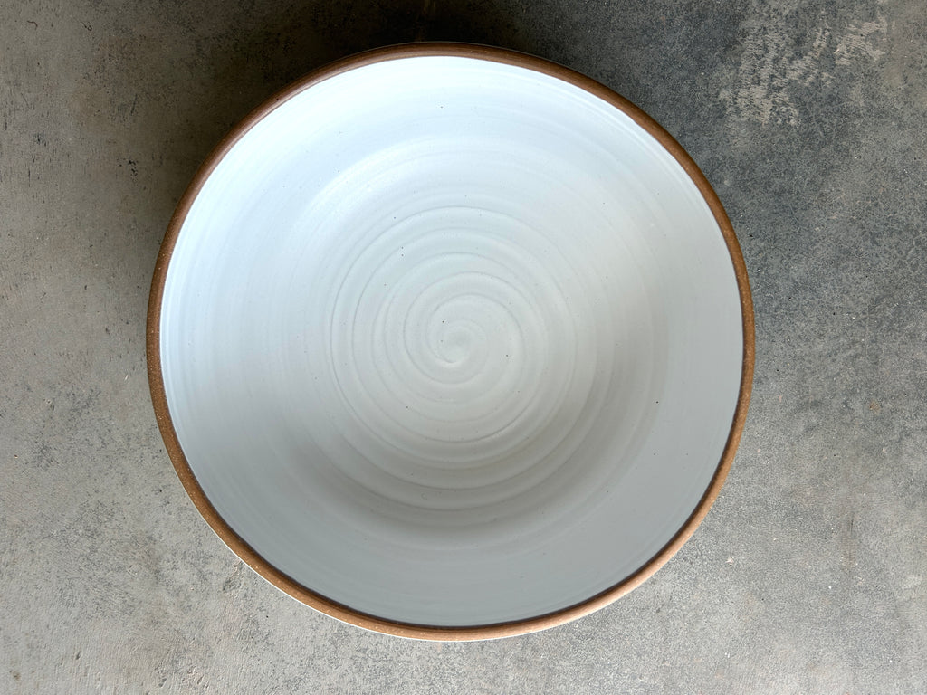 matte white, raw rim, approximately 11” diameter x 4.5” high